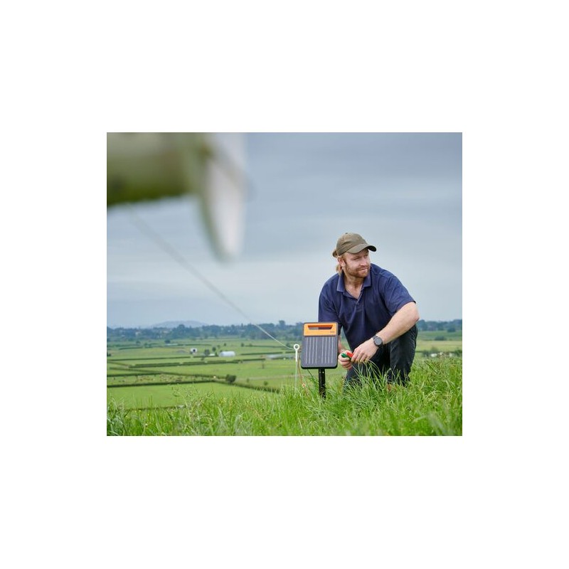 Plaats het apparaat met het zonnepaneel naar het zuidenwesten gericht en vrij van begroeiing. Aard het met één aardpen van 1 meter. De rode en groene kabels met krokodillenklemmen om het apparaat aan de afrastering en aardpen te verbinden, zijn inbegrepen. Laat het apparaat zichzelf na aanschaf of opslag eerst drie dagen in het daglicht volledig opladen door het in de uit-stand naar het zuiden gericht te plaatsen. Doe dit ook als het rode LED-lampje aangeeft dat de accu bijna leeg is. Bewaar het apparaat bij langdurige opslag op een donkere, droge en geventileerde plek.